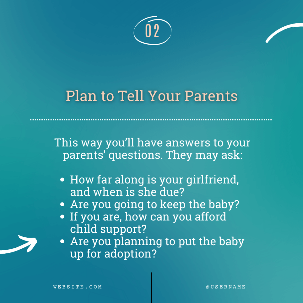 You need to be in a calm headspace before you are able to speak with your parents (4). Telling them is the right thing to do. But you need to wait for the right time to break the news, which is not while you are still panicking about the positive pregnancy test. Consider these questions when deciding the right time to tell your parents: