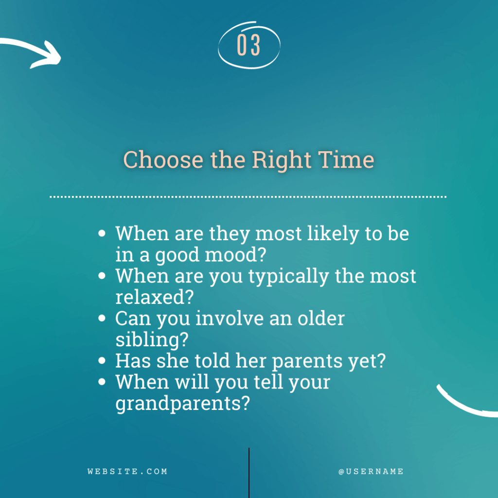 - Do you have a good relationship with an older sibling? It may be a good idea to involve them in determining a good time and method for delivering the news.