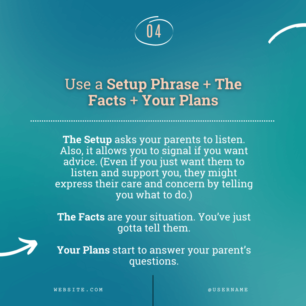 The Setup asks your parents to listen. Also, it allows you to signal if you want advice. (Even if you just want them to listen and support you, they might express their care and concern by telling you what to do.)