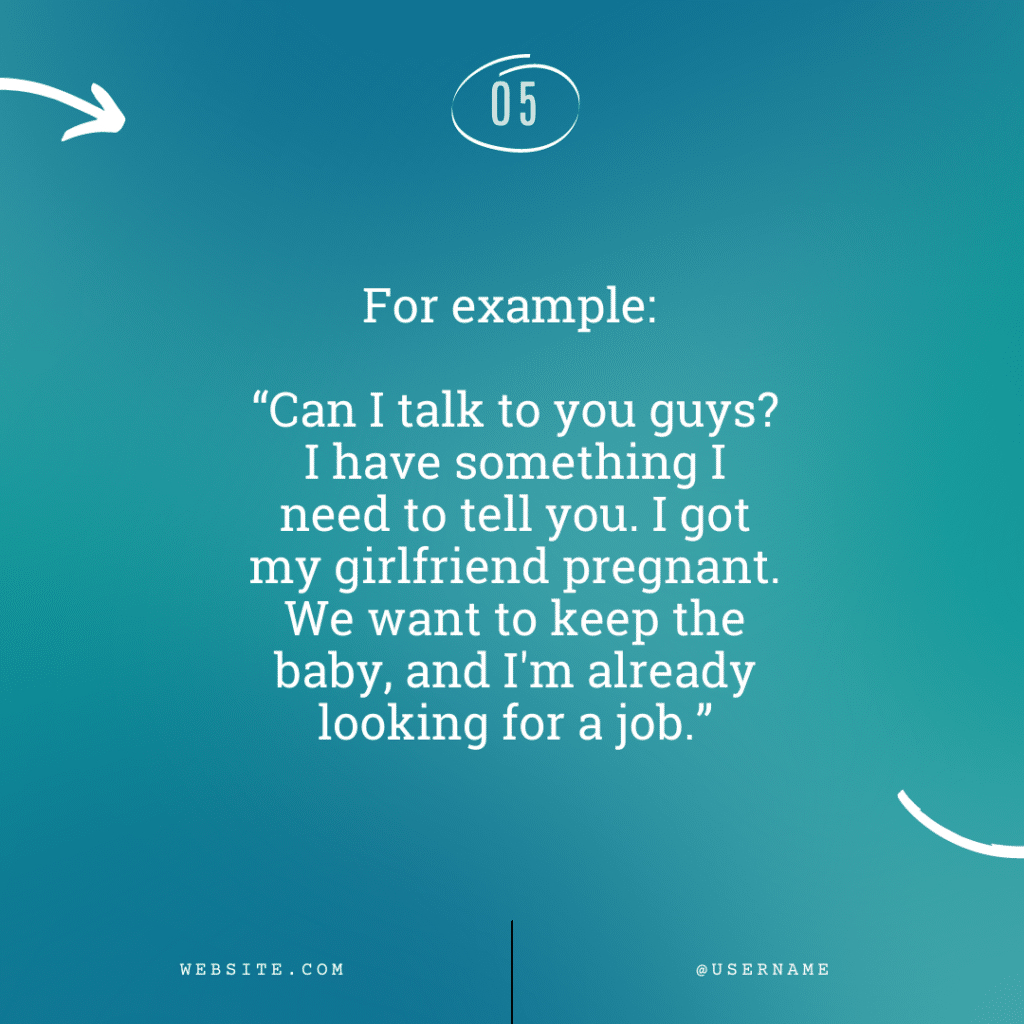 - “Can I talk to you guys? I have something I need to tell you. I got my girlfriend pregnant. We want to keep the baby, and I’m already looking for a job.”