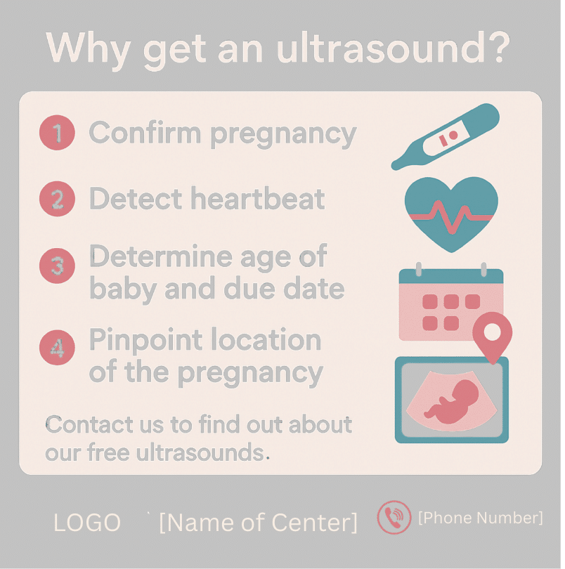 One of the most important first steps after a positive pregnancy test is getting an ultrasound. An ultrasound gives you clear medical information so you can understand what is happening in your body and make a safe, informed decision about your pregnancy. With this safe and accurate procedure you will also be able to detect the fetal heartbeat, determine the baby’s age and approximate due date. One of the most exciting services we offer at [Name of Center] is a FREE ultrasound.